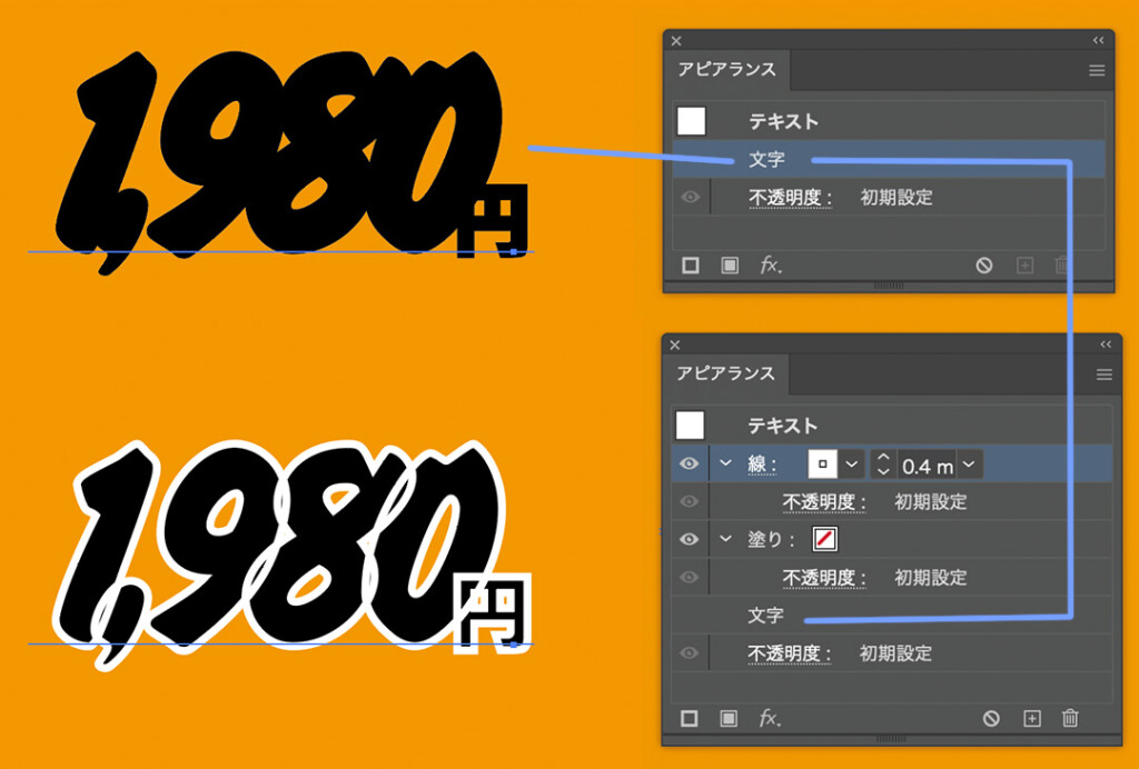 続いてアピアランスに線を追加しアピアランスで適用させていきます。下図参照