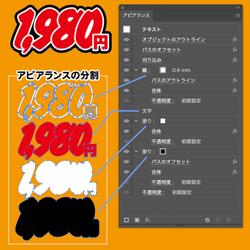 今回はスーパーチラシでよく見かける価格表示に使う『くいこみ数字』のやり方です。