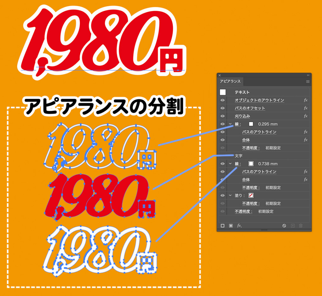 アピアランスの分割後は合体していますのでアンカーポイント量が少なくなります。