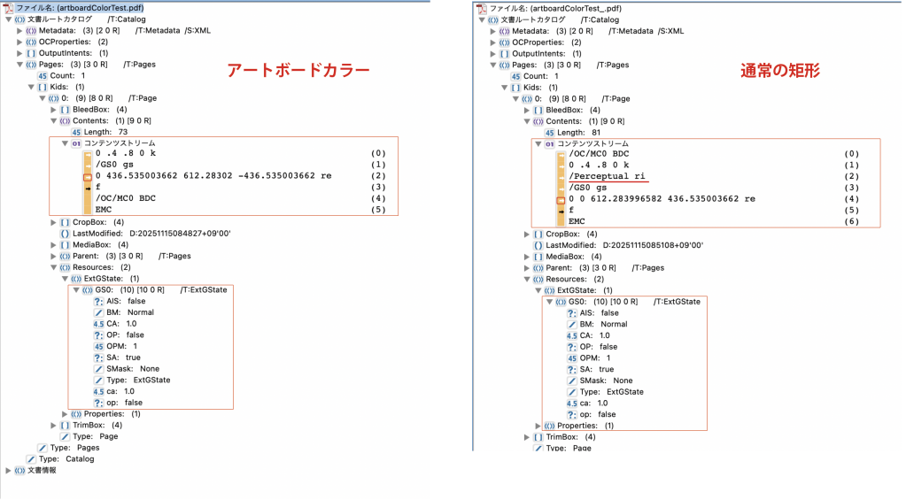 おおよそのコマンド類は一致していますが、通常の矩形ではriコマンド付加されています。これはレンダリングインテントの指定で引数がPerceptualと知覚的に設定されています。唯一の相違点がこのレンダリングインテントの有無なんですけど、設定を拾ってきているので、明示的に指定しているか否かの違いしかなく問題とはなりません。また、拡張グラフィックステートの内容は全く同じになります。