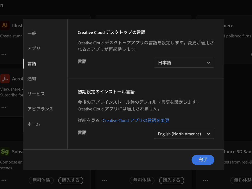 4. CCデスクトップアプリの環境設定の「言語」の所の「初期設定のインストール言語」を「日本語」に切り替えます。